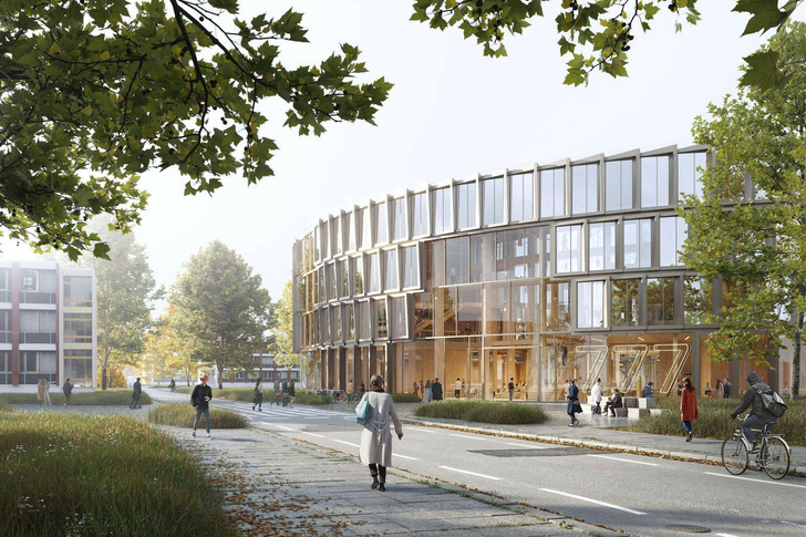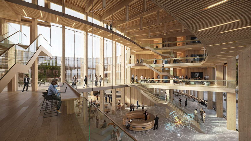 The circular design, with a sheltered courtyard at its heart, seamlessly connects forest, park and plaza. Office, laboratory and workshop space are combined within the open timber building.