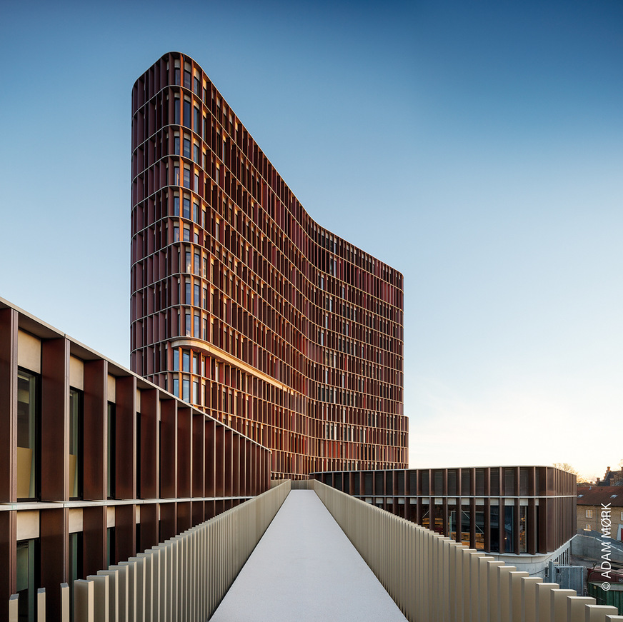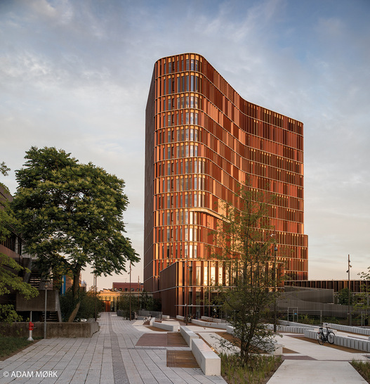The Maersk Tower is already a new landmark of Copenhagen a year after it was opened. As part of the Panum Institute of the University of Copenhagen, that is home to the Department of Health and Medicine, the three-bladed, slightly corrugated tower is Denmark's most energy-efficient laboratory building. Rainwater collected for toilet flushing and garden irrigation, automated LED lighting, a connection with the remote cooling system, many green areas and roofs and in particular the unique solar protection solution all contribute towards this. A design resembling a relief of horizontal fibreglass elements and 3,000 vertical copper-clad fins was installed in front of the transparent aluminium facade with storey-high triple-glazed IG units and panels. These panels act both as solar protection and as a windbreaker. The blinds that have in some cases been designed as movable elements react to the weather. Where there is a large amount of sunlight, copper grids automatically protrude from the slats. They reduce the energy input, but still allow daylight to enter the rooms. Choosing copper as a material was not arbitrary, but was intended to allow the building’s facade to fit in with the surrounding architecture of traditional brick edifices.