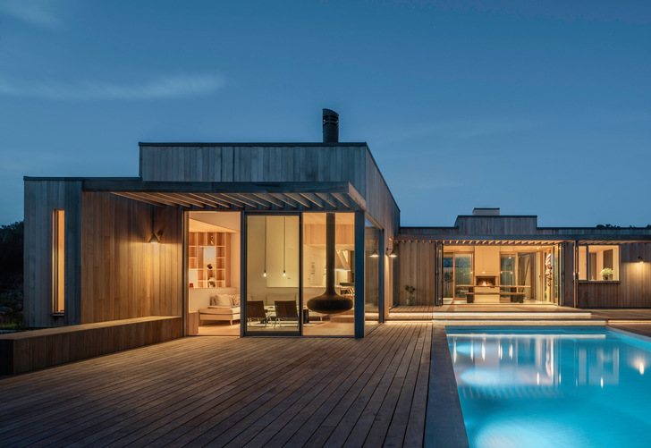 On Sweden's coveted west coast, Jörgen and Katarina have created an exclusive retreat that combines the elegance of the Hamptons with Scandinavian minimalism. Danish architect Lotte Elkiær from elkiær + ebbeskov arkitekter aps designed the single-story, U-shaped luxury residence with a warm cedar wood facade.
