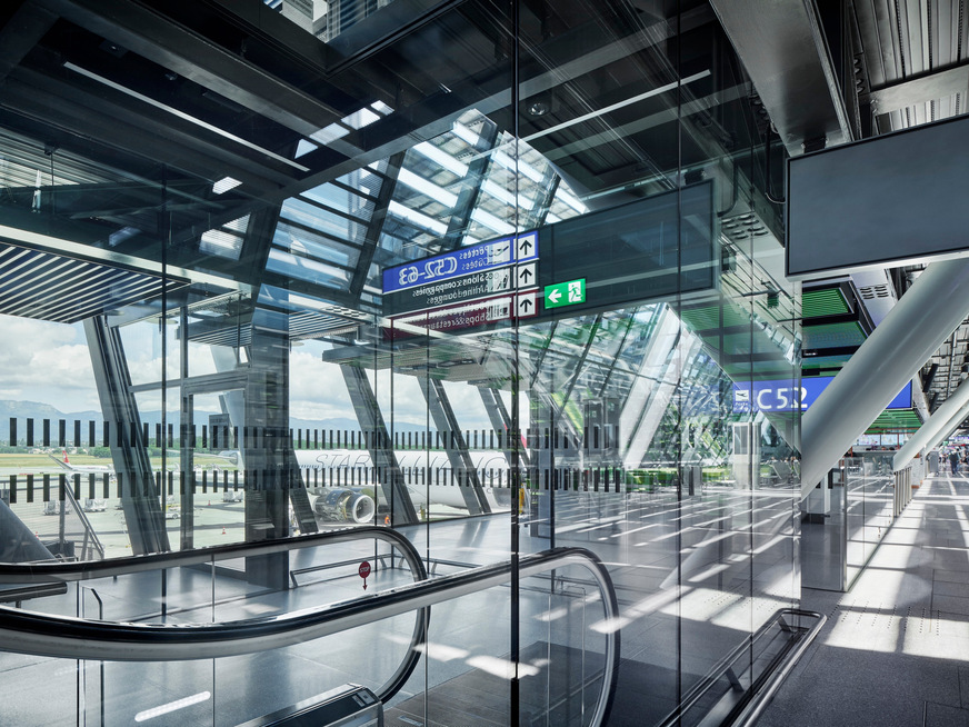 Glass walls, which serve to direct the flow of people, provide plenty of daylight inside the building and facilitate orientation. The balustrades of the moving walkways and numerous doors are also made of glass and support the open, cheerful character of the architecture.