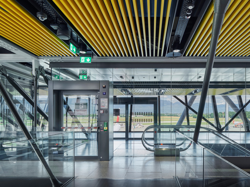 The geometry of the structure, which is a parallelogram in cross-section, lends the terminal building lightness and elegance. The inclined glass facades emphasise the floating character of the terminal and offer passengers an unobstructed view of the runway and the Jura Mountains.