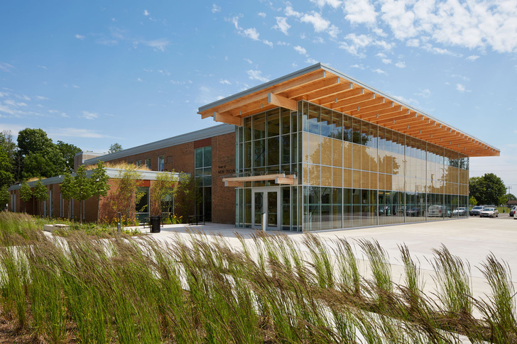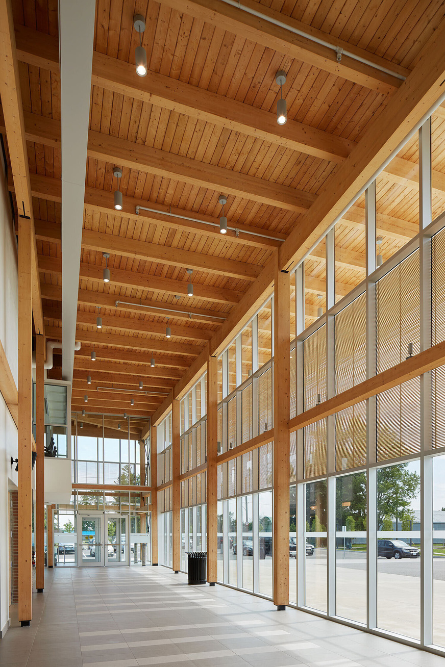 Wooden louvres integrated into the insulating glass allow warm, filtered light to enter the building, enhancing its architectural identity and creating an inviting, community-oriented atmosphere.