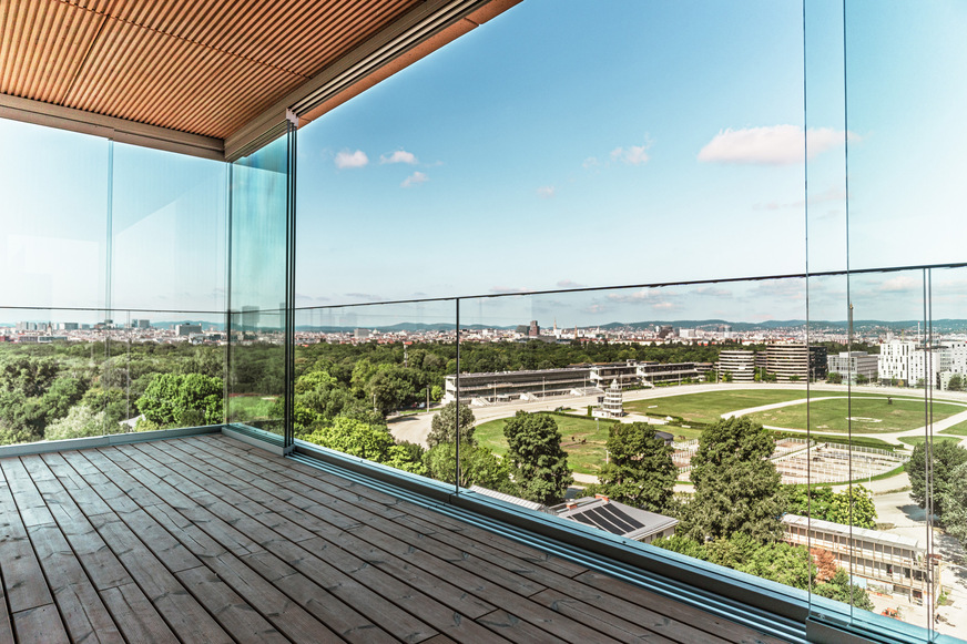 An essential component of the “Grünblick” building envelope are the glass railings from Glas Marte's GM Railing Uni system. They were modified several times for the project – including color-matched substructures and special screen-printed motifs. The system is characterized by its strutless design, which offers maximum transparency. The factory-prefabricated glass modules avoid stress peaks and enable clean, controlled installation.