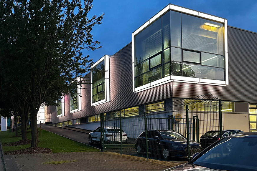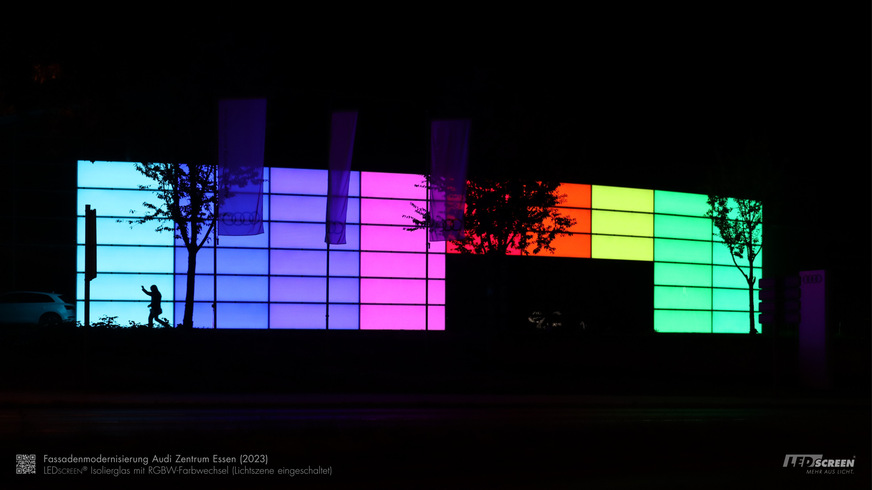 The glass facade on Altenessener Straße in Essen consists of a main facade and four bay windows, all of which can be illuminated. In the evening, it shines in a pleasant white or, according to the client's wishes, in different colours.
