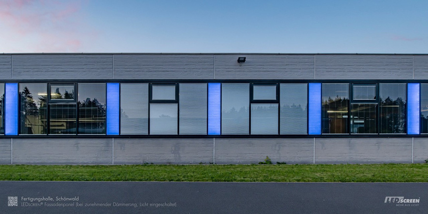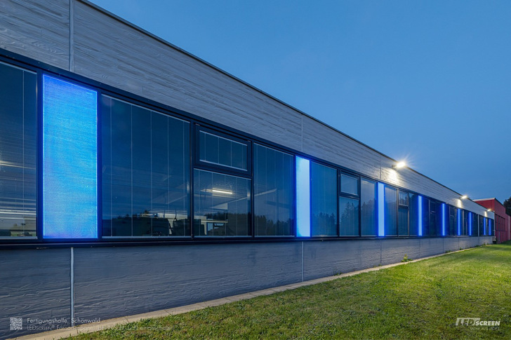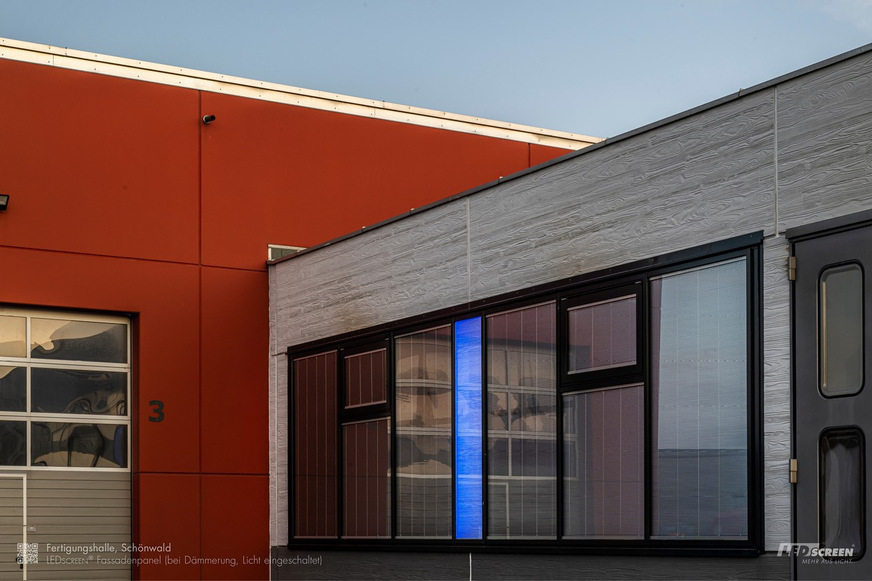 Visually, there is another special highlight on the facade. Between the window areas are LED screen facade panels that glow blue at night in the company colour. During the day, they are perfectly matched to the concrete wall in plaster look, so they are not visually noticeable. These LED screen facade panels were bonded as sandwich panels with insulation boards in order to guarantee the required thermal insulation.