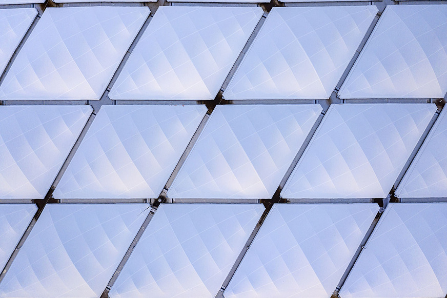 Architect Jurek Slapa created a cushion-shaped structure of glass-fibre fabric for this purpose and created a living artificial sky that changes its face with the weather during the day and is illuminated by an exciting light show when it gets dark. The roof stands on 19 slender concrete supports and consists of a geometrically rigorous steel construction with 94 evenly spaced lozenges. The actual roof skin appears light as a feather. The upper side is covered with a translucent glass fibre membrane, which gives it the appearance of a cloud with its white, diamond-shaped cells. The polyester fabric on the lower side is transparent and allows a view through the delicate construction up to the cloud-like roof. The shape of the two membrane surfaces is spanned by internal steel arches.