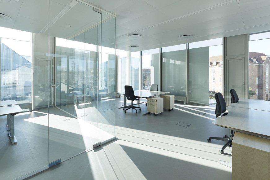 It was particularly important to the architects to enable an abundance of glare-free daylight to enter the offices, laboratory and research facilities in order to achieve a comfortable working atmosphere in the interior rooms. The rooms in which people stayed for longer durations should also have an unlimited view to the street in the public space. These specifications require a transparent facade without closed parapet areas. The climatic conditions in northern Europe, however, necessitate a shell with very good heat insulation.