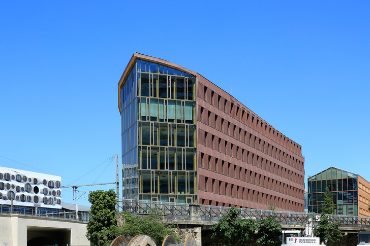 The building, designed by architect Anne Carcelen, rises eight storeys. A VMZinc surface in Pigmento red covers the two long sides of the facade. On each floor, two horizontal rows are alternately inclined slightly downwards and upwards. In this way, direct sound reflection in a straight direction is avoided and the sound is diverted towards the ground or the sky. At the same time, the angled surface acts as a diffuser, dispersing the noise of rail traffic and thus reducing it overall. With this acoustic protective function, the authority location assumes responsibility for the urban environment. In order to maintain the visual unity of the building, the special construction method of the "soundproof surface" is also duplicated on the side facing away from the rails.
