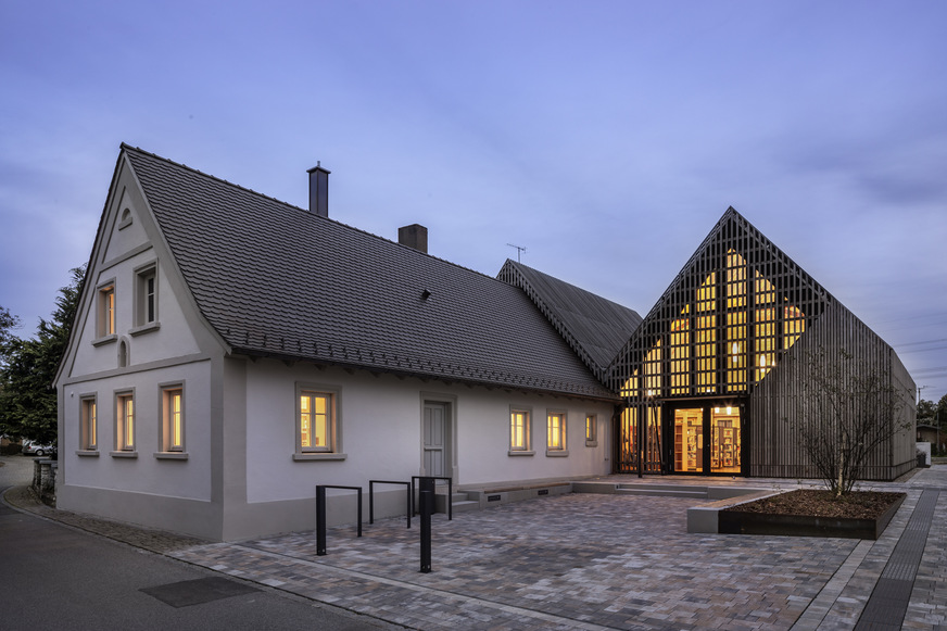 A residential house and behind it, facing the edge of the village and the fields, a barn and a stable. This ensemble construction method, traditional for small villages in Upper Franconia, was implemented in a modern and forward-looking way in the renovation and extension of the library in Gundelsheim.