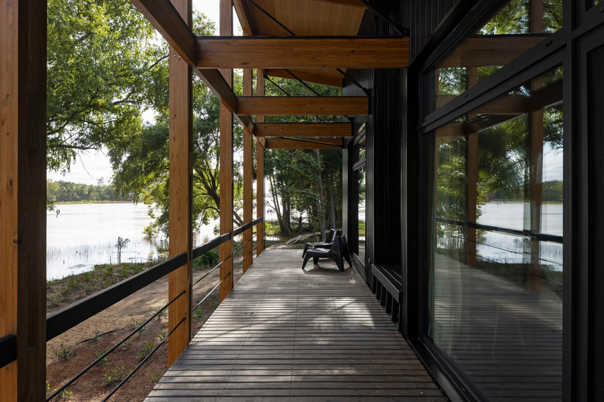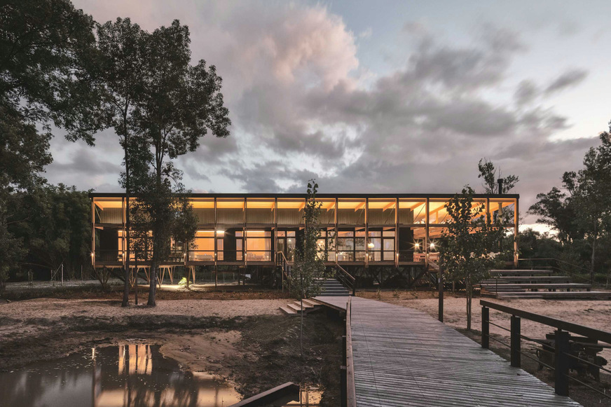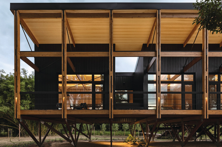 That is why MAPA Architects opted for the concept of an amphibious house. The term describes a construction method that allows the building to adapt to rising and falling water levels. Wooden stilts lift Casa Biguá two metres above the ground to protect it from periodic flooding in the Paraná Delta. The building that rises above the floor plate is also a lightweight timber structure, in keeping with the traditional construction methods used on the islands of the delta. The house was built using prefabricated units that could be transported on small boats.