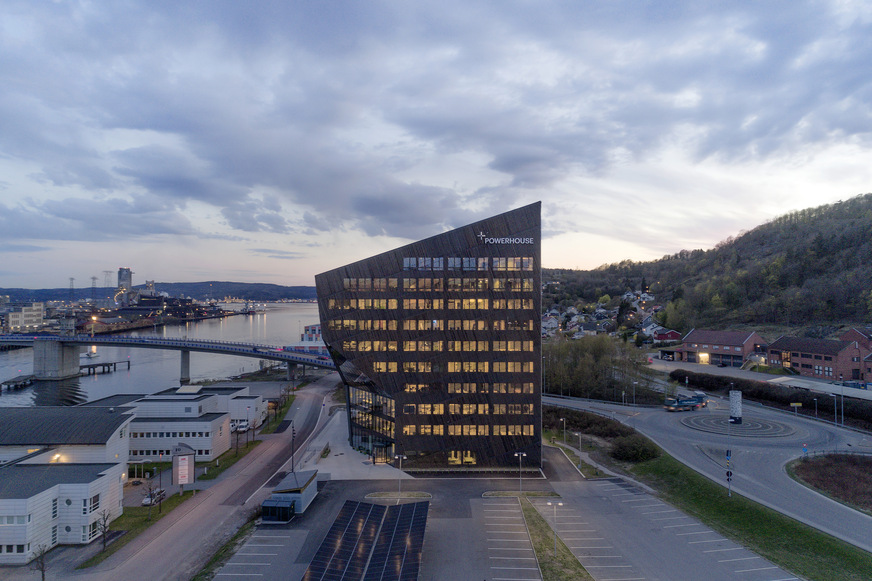 The silhouette of the Powerhouse Telemark in the industrial city of Porsgrunn in Norway is visible from far away. When the sun is shining, the eleven-storey office tower glistens like a super-sized diamond. Its roof terrace offers stunning views of the regional centre of the province of Telemark and its 35,000 residents, as well as the Frierfjord beyond. Completed in the summer of 2020, the zero-emissions building has become a symbol for the region’s transformation into a green economy in an area which lies 150 kilometres south of Oslo and has a long history as an advanced centre of industry. One of the largest hydroelectric power plants of the early 20th Century, Vermork, is in the same province as Porsgrunn and is part of a UNESCO World Heritage Site.