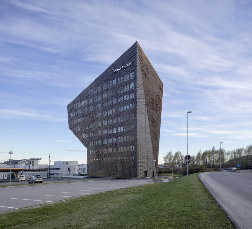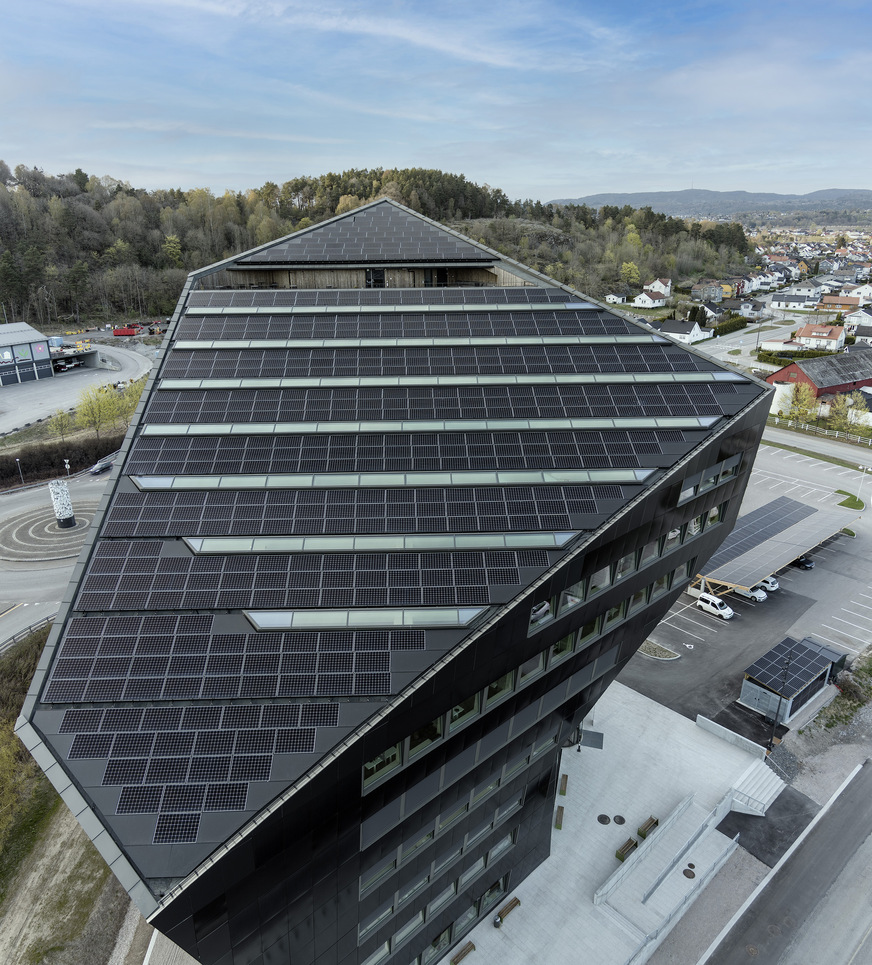 The iconic, tapered building shape doesn’t just look good. It is also beneficial from an energy-efficiency point of view. In order to absorb as many of the sun’s rays as possible, the roof was tilted by 24° towards the south and fitted with highly efficient, integrated photovoltaic modules made by Danish company SolarLab, with an efficiency rating of 22 percent and an output of 210 kilowatt peaks. The angled southeast facade, which slopes upwards, has the same design, as does the roof of the carport next to the building. Measuring almost 1500 m2, the module area produces around 243,000 kilowatt hours of solar energy. Of these, only 50,000 kilowatt hours are required to run the building, while around 193,000 kilowatt hours are retained to offset the carbon footprint and stored in internal 130 kilowatt-hour batteries. Any excess power that is produced is fed into the car charging stations and thereby back into the energy cycle. Over a lifecycle of 60 years, the energy-plus building generates almost 15 million kilowatt hours of carbon-neutral power in this way. This makes Powerhouse Telemark one of Norway’s most effective solar power stations, according to the figures given in “Norway: Heating and cooling commercial and industrial buildings with renewable energies”, published by the German-Norwegian Chamber of Commerce in Oslo.
