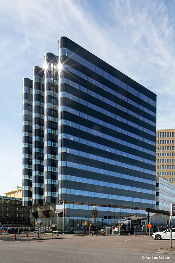 The building with its rounded edges has reflective glazing made of cylindrically curved elements, with two-tone stripes and alternate between concave and convex; a tribute to the maritime heritage of Gothenburg.