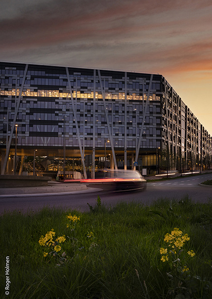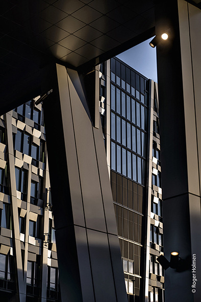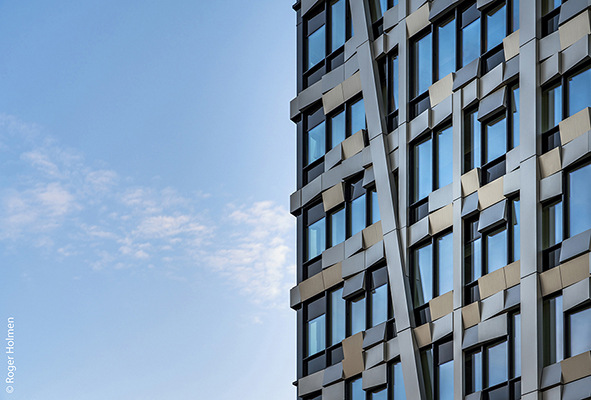 The client and owner is Oslo Pensjonsforsikring. The complex offers 80,000 m2 of space for offices, a hotel, common areas and a food court. Urban gardening, beehives and a running track are planned on the green roofs. Despite the size, the DARK Arkitekter office has managed to breathe lightness into the design. The building stands on stilts to allow for fluid transitions between the public park and the commercial spaces. The aesthetics of the facade, installed by Staticus, establish a connection with the surrounding nature through the arrangement of its 1,588 trapezoidal aluminium elements. Vertically running bands are reminiscent of tree trunks, while the faceting of the horizontal "leaf elements" creates plays of light and shadow and emphasizes the liveliness of the building envelope. The sophisticated system of solar shading, opaque surfaces and double glazing ensures that the facade meets all regulations and energy efficiency requirements.