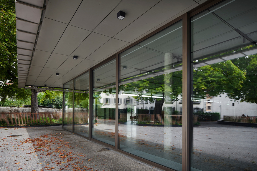 The architects at Pont12 paid particular attention to the seamless integration of the existing building into the structural design. Thus, in the course of the renovation of the adjacent ballroom, the access elements were fully glazed and now contrast as filigree bands with the otherwise solid building envelope.