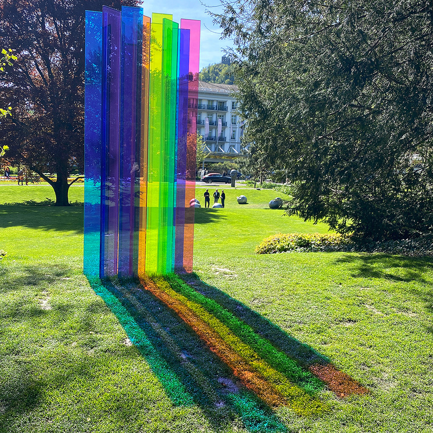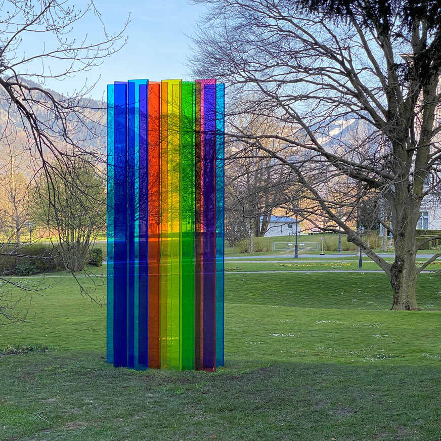 The almost three-metre-high sculpture Tri Colore by Kathrin Severin stands directly in front of the Grand Resort Bad Ragaz. For it, the artist designed ten steles made of glass in the three primary colours magenta, cyan and yellow.