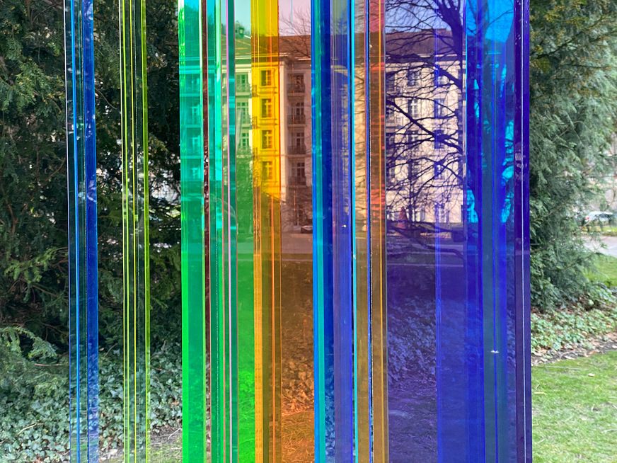 Severin chose laminated safety glass (LSG) with Swisslamex Colordesign PVB interlayers from Glas Trösch for her sculpture. The glass sculpture becomes particularly exciting when the sun shines through the LSG panes: then the colourful LSG panes cast coloured shadows.