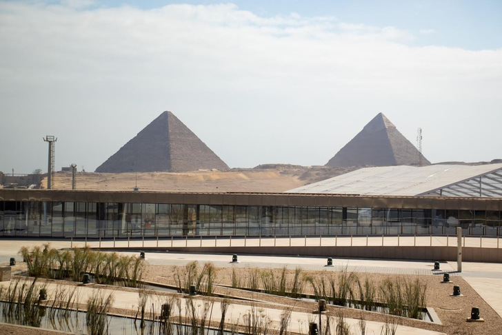 The expansive floor-to-ceiling windows not only illuminate the museum’s interior with natural light but also frame spectacular views of the Giza pyramids, connecting visitors with Egypt’s timeless landscape.