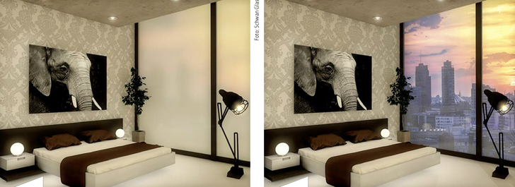 There are almost no limits to the possible uses of the smart glass from Schwan Glas and Glas Mayer Ginsheim: as fixed glazing, partition walls in offices and meeting rooms, hotels, banks, museums and in shops, and much more.