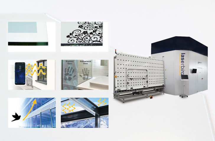 The laser processing of the glass or IG units is carried out stationary with the Laserbird processing system, which can also functionalise mobile radio-permeable or heatable glass in addition to bird protection. The parameters are stored in the app control system. Finishing takes place without set-up times.