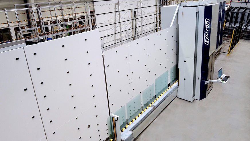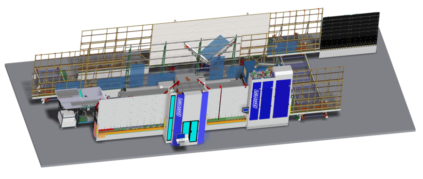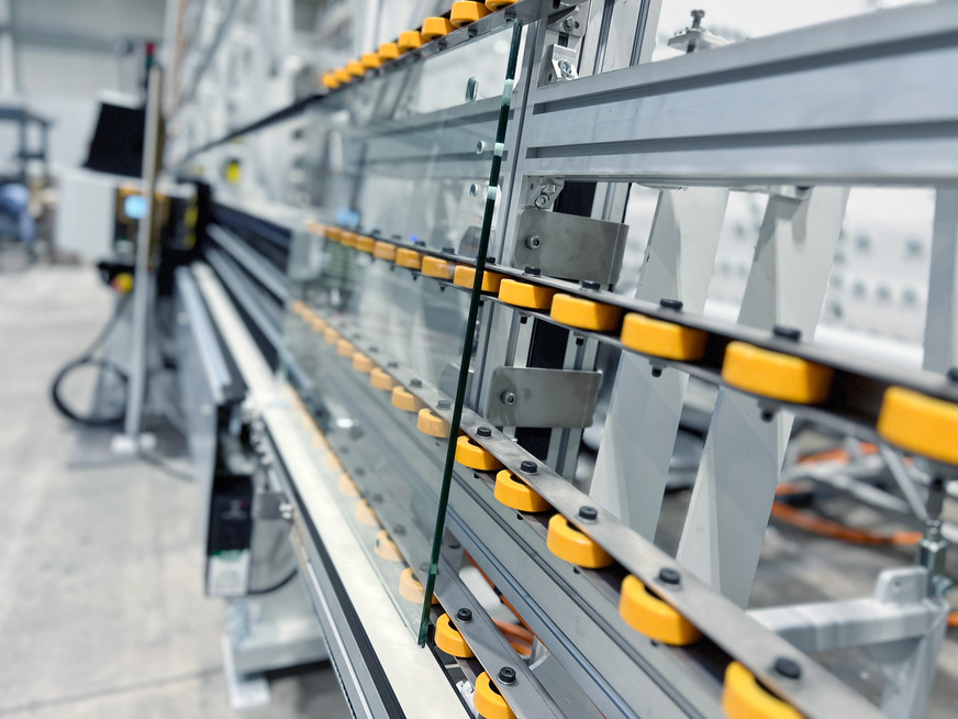 The system is fully virtualised so that the glass panes can be synchronised at defined checkpoints using sensors. This enables automatic adjustment of the dynamics (speed, acceleration, deceleration) depending on the dimensions of the glass. For example, a square glass pane undergoes greater acceleration than one with a length-to-height ratio of 1:8, which increases production reliability. The operator can always see the entire process on the operator panel and can communicate with the system via the virtualised view.