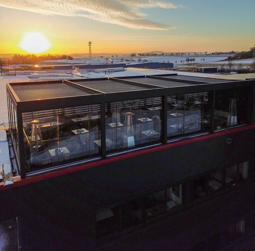 A special jewel towers over the town of Öhringen: The Rooftop. This exclusive bar not only offers exquisite drinks and tidbits, but also a breathtaking view of the picturesque town and its surroundings. Whether at sunset or under the starry sky – the lounge/bar is the perfect place to escape from everyday life. Four Qube 23 units were installed in a row to the left and right of the central section of the bar. Each unit measures a total of 12.5 × 6.5 metres. In order to create a smoking area, the outer part of the roof on the right was designed in two parts as a special solution.