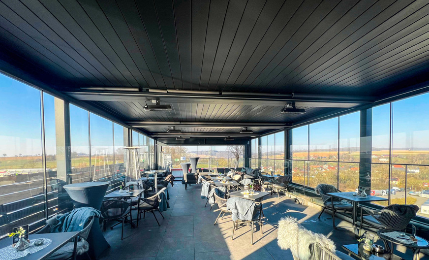 With its maximum size of up to 31.5 square metres and a span of 6.5 metres, it offers sufficient space to accommodate a smoking area, in which the outer part of the roof on the right was designed in two parts as a special solution. Erhardt Outdoor Living solved the challenge of providing a pleasant climate even in weather conditions such as rain, wind, snow and sunshine with its Qube 23 slatted roofs and sliding glass walls manufactured in-house.