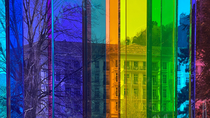 One of the largest sculpture exhibitions in Europe, the Bad RagARTz, is drawing visitors to the Swiss spa town of Bad Ragaz until the end of October 2021. The glass sculpture Tri Colore by the artist Kathrin Severin, which is made from glass by Glas Trösch and casts coloured shadows, can also be seen there.